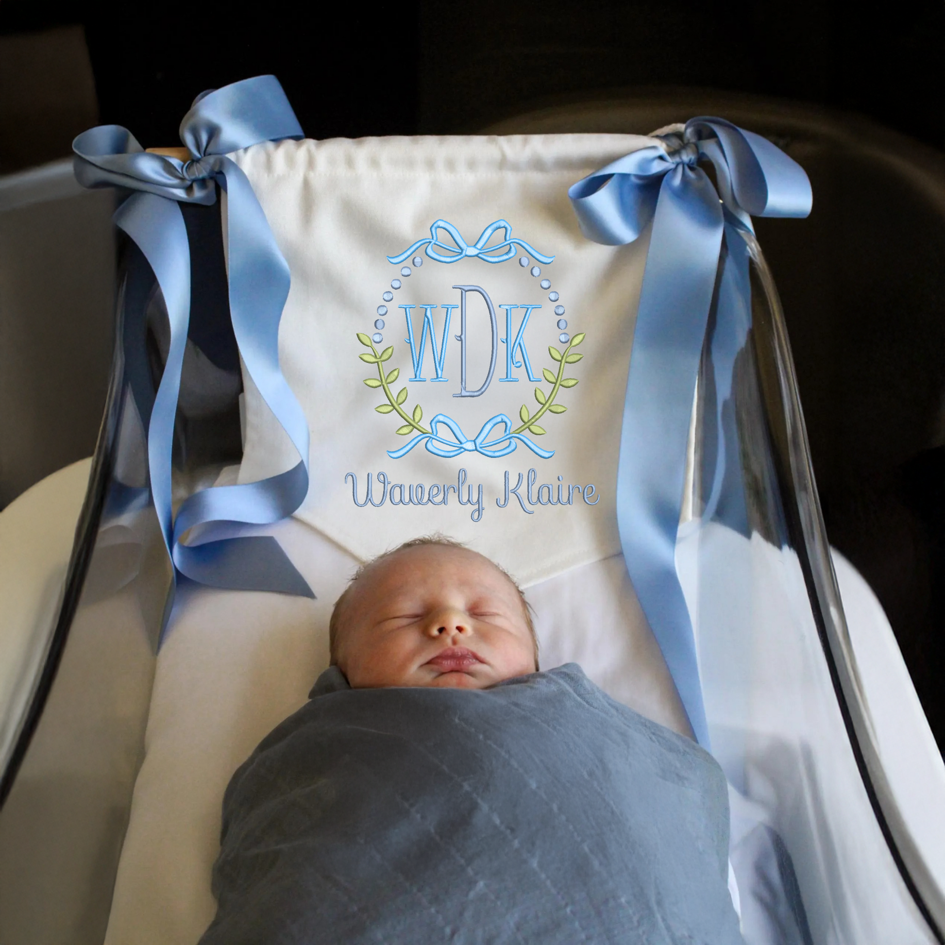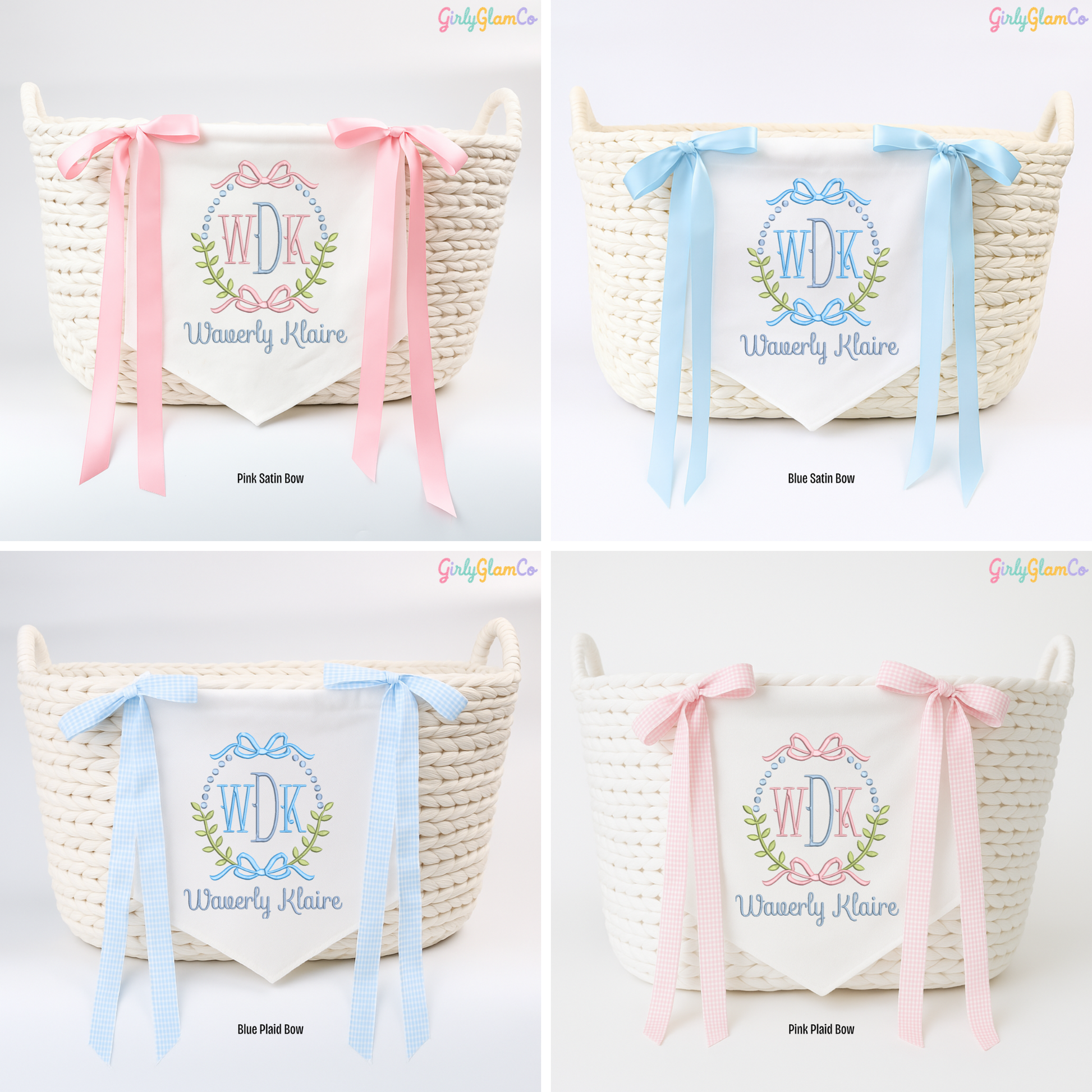 Floral Scroll Monogram with Bow Accent โ Personalized Baby Banner, Newborn Hospital Door Sign